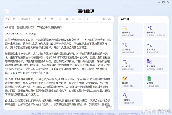 • 体验:我按住AI键说:“写一篇关于智能手表X1发布的新闻稿,800字左右,突出其健康监测和长续航功能,风格正式且具有吸引力。” Deepseek模型迅速响应,光标闪烁间,一篇结构完整、要点突出、文笔流畅的稿件已然成型。